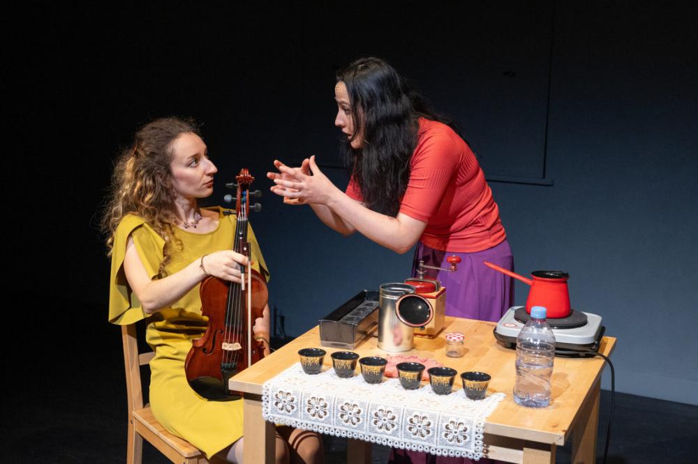 Zwei Frauen begegnen sich in der Schweiz. Die eine kommt aus Syrien, die andere aus der Ukraine. Beide kamen als Asylsuchende, doch ihre Startbedingungen könnten nicht unterschiedlicher sein. Bei einem Kaffee treffen die Frauen unfreiwillig aufeinander, reden und singen gegen- und miteinander, bis sich ihre Sprachen und Klänge zu einem überraschend neuen Sound verbinden.