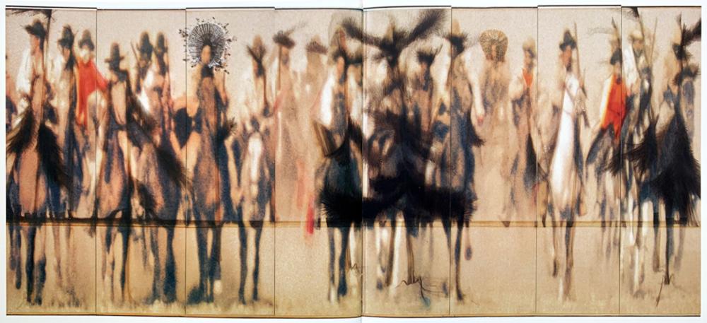 Im Zentrum der Ausstellung steht das mehrteilige, 2023 angekaufte Werk Wild Bunch. Sala überlagert hier mehrere Bildebenen: Figuren, die uns auf dem ersten Blick vertraut erscheinen, verschwimmen wie eine optische Täuschung. Durch die Vermischung von Wirklichkeitsebenen eröffnet uns Mario Salas Kunst eine traumwandlerische Dimension.