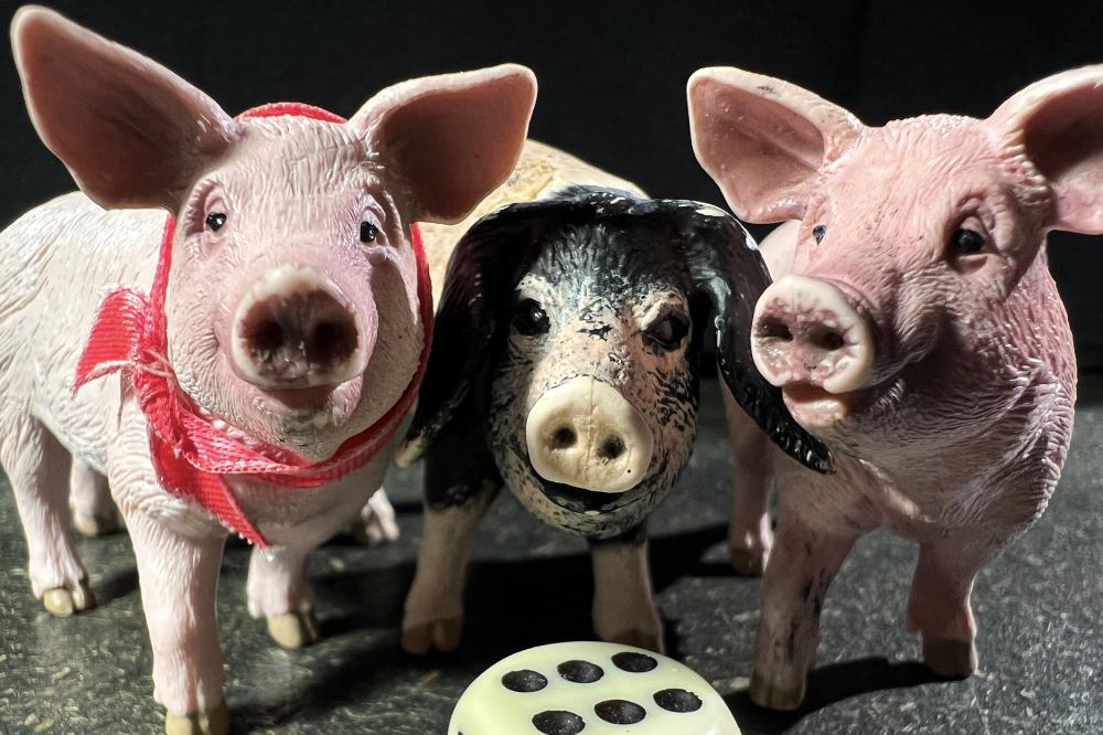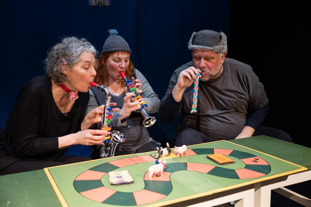 Mit Würfel - und Brettspielen, Domino- und Duplosteinen und anderem Spielzeug wird die Geschichte der drei kleinen Schweinchen sinnlich lustvoll erzählt und der Wolf mit schweinischer Freude ausgetrickst.