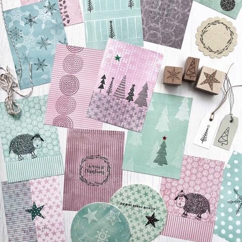 Mit der Gelli Print-Drucktechnik entstehen einzigartige Hintergünde, die mit Stempel & Stickern zu persönlichen Weihnachtkarten oder Geschenkanhängern gestaltet werden. Eine grosse Auswahl an Stempelkissenfarben, Stempeln, Stickern und Schablonen stehen bereit.
