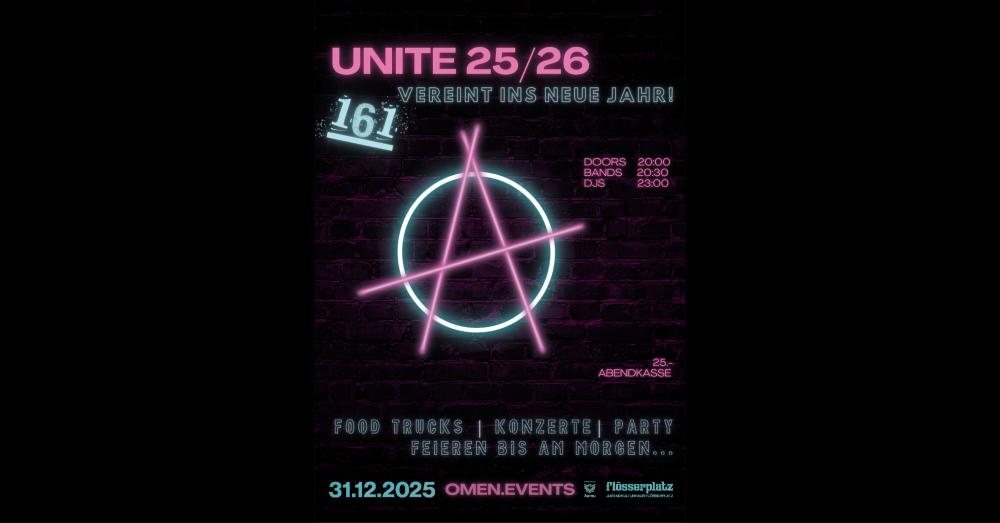 UNITE25 im Flösserplatz Aarau. Am 31.12.2025 öffnen wir um 20:00 die Türen, die Bands starten um 20:30.