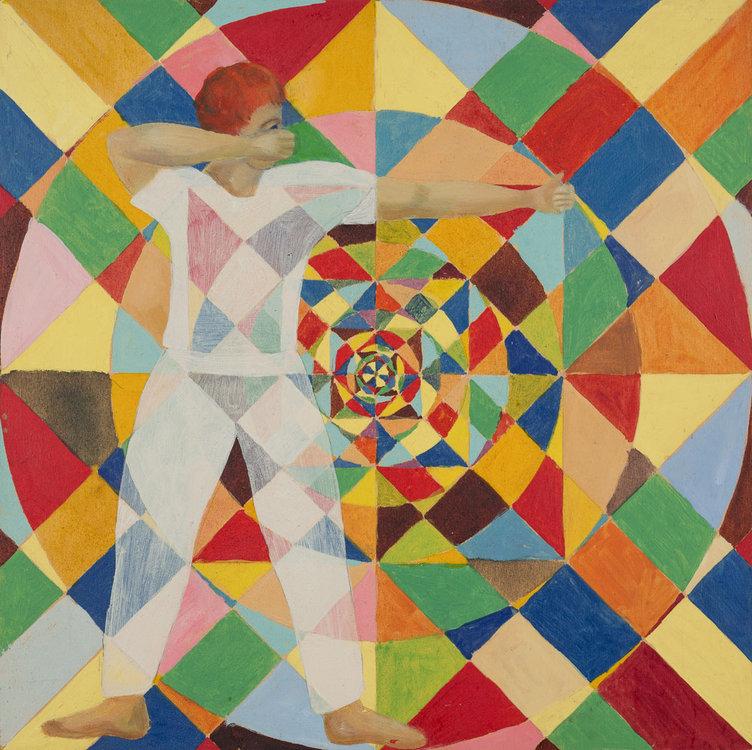 Die kleinen Formate der Aargauer Künstlerin Gabi Fuhrimann (1958–2021) laden zum Heranrücken ein. Die meist quadratischen, geometrisch gebauten Gemälde sind wie ein Mosaik angelegt. Oft steht als Motiv eine Frau im Zentrum. Der Körper verschwindet dabei fast im Farbengefüge – aber eben nicht ganz. Unsere Nähe zum Bild schafft eine intime Betrachtung, wie bei einem Andachtsbild, bei der wir die Figur beim Lesen, Tanzen, die Arme-Ausbreiten sehen. Jede von uns könnte diese Frau sein: So wird das Bild auch zu einer Projektionsfläche oder sogar zu einem Spiegel.