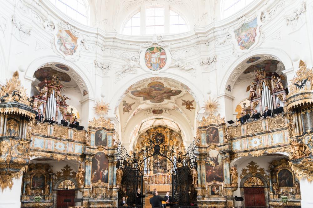 Athanasius Kircher, Universalgelehrter des Papstes in Rom, griff diesen Gedanken auf und entwarf seine Vision einer umfassenden «Weltharmonie». Die Klosterkirche Muri mit ihrem Oktogon und den vier Musikemporen ist steingewordener Ausdruck dieser Vorstellung eines wohlproportionierten, klingenden Kosmos, in dessen Zentrum wir als Zuhörer:innen regelrecht im Klang der vielen Stimmen schweben. Komponisten wie Orazio Benevoli entwickelten in der Mitte des 17. Jahrhunderts den römischen «Kolossalstil» und erschufen durch Vielstimmigkeit und Mehrchörigkeit eindrucksvolle Klangräume.