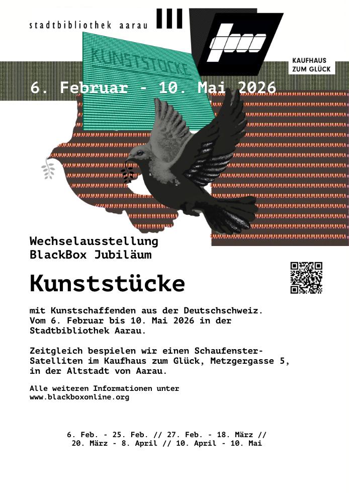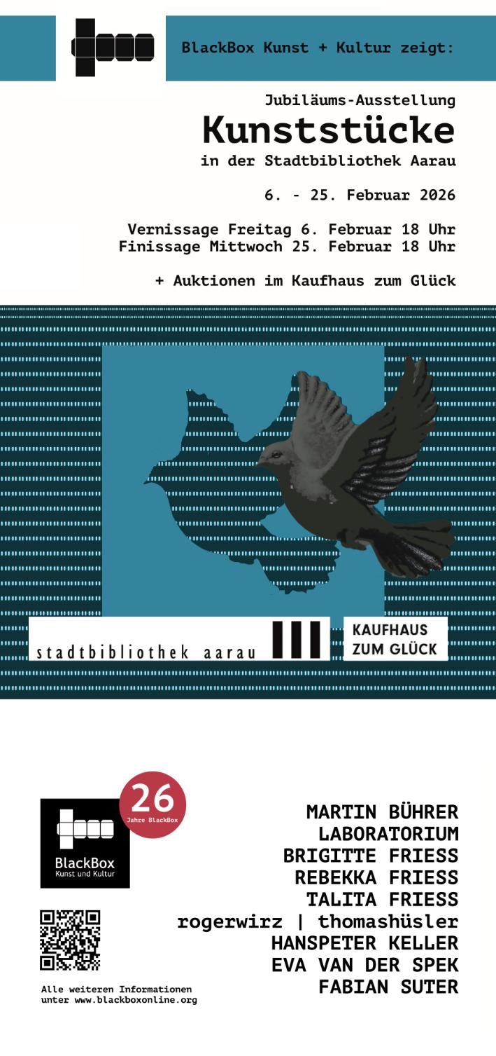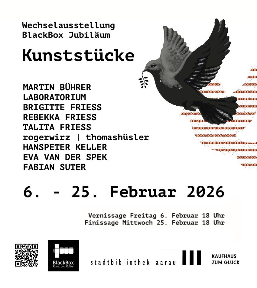 BlackBox Kunst und Kultur feiert ihr 26-jähriges Bestehen und organisiert in der Stadtbibliothek Aarau eine Wechselausstellung mit Kunstschaffenden aus der Umgebung und über die Kantonsgrenze hinweg. Es finden vier Vernissagen statt, am 6. Februar, 27. Februar, 20. März und 10. April. Jeweils um 18 Uhr.