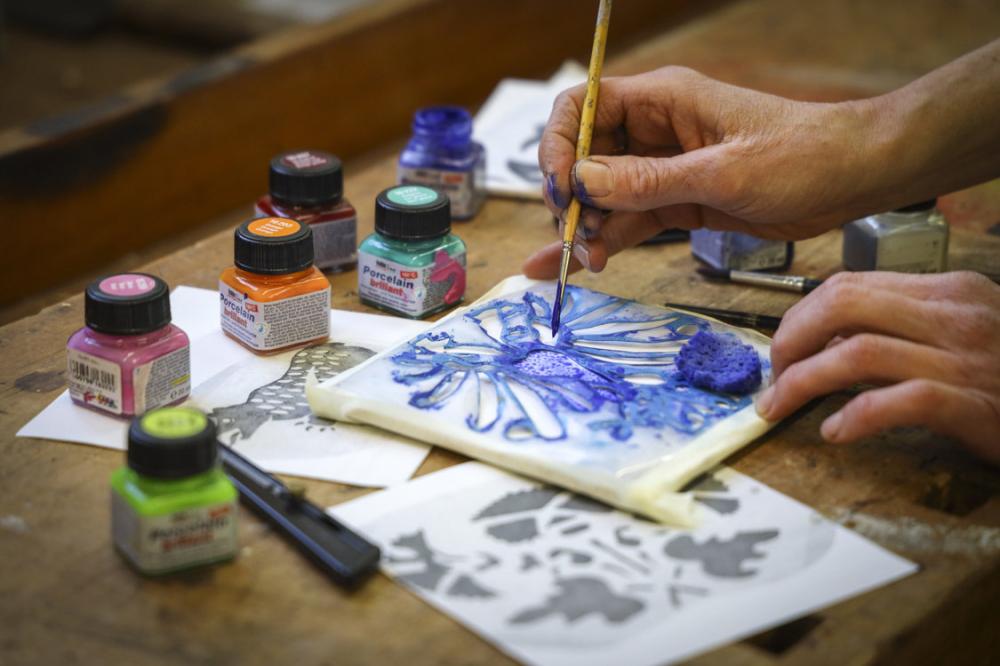 Am Ateliernachmittag auf Schloss Hallwyl werden Kacheln gestaltet, die als farbige Topfuntersetzter den Tisch daheim verschönern. Ob mit Schablonen oder frei bemalt – der Kreativität sind keine Grenzen gesetzt.