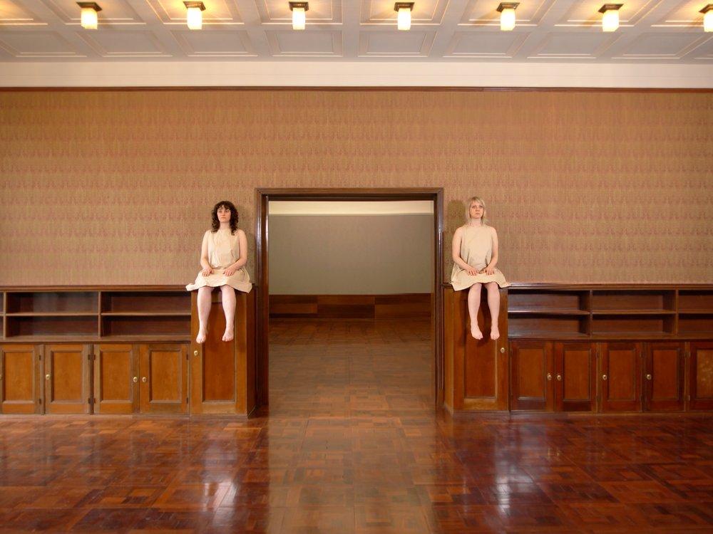 Jasmin Bigler (*1993 in Bern, lebt dort) und Nicole Weibel (*1990 in Niederhünigen, lebt in Bern) arbeiten seit 2014 als Duo BiglerWeibel zusammen. In ihrer künstlerischen Praxis erkunden sie Raum und Körper und verschränken Performance und digitale Medien zu ortsspezifischen Interventionen aus einer dezidiert weiblichen Perspektive. In einer Kabinettausstellung zeigen sie ihre Erkundungen in der Langmatt während der Renovation in Form einer Mehrkanal-Videoinstallation unter Einbezug von historischem Mobiliar aus der Sammlung. Zur Ausstellung erscheint ein Daumenkino.